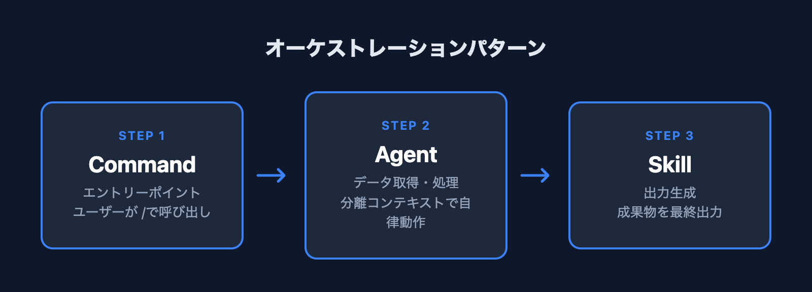- オーケストレーション:Command → Agent → Skillの階層パターン