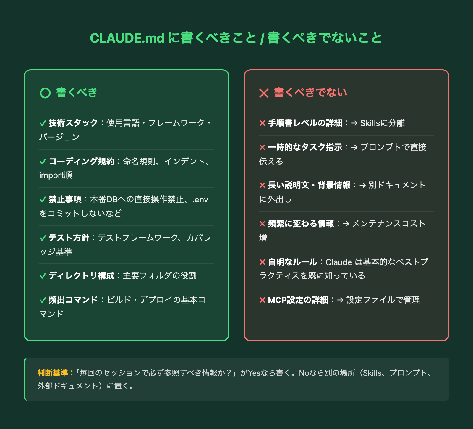 手順書レベルの詳細な作業フローは、Skills機能に分離するのが正解です。Skillsは必要なときだけ呼び出されるため、常駐コンテキストを圧迫しません。一時的なタスク指示はプロンプトで直接伝え、長い背景情報は別ドキュメントに外出しする。この切り分けが、CLAUDE.mdを軽量に保つ鍵です。