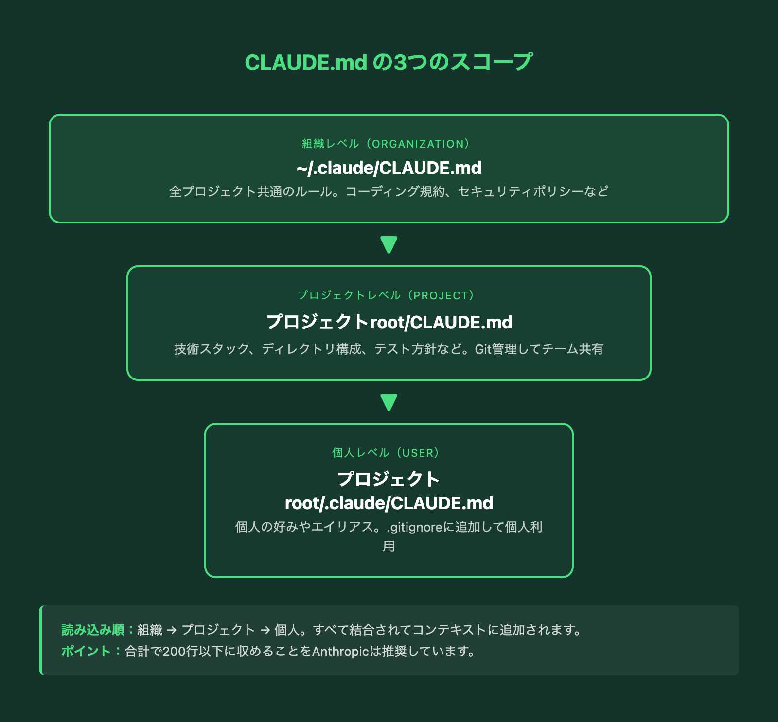 これら3つは起動時に組織→プロジェクト→個人の順で結合され、1つのコンテキストとしてClaudeに渡されます。