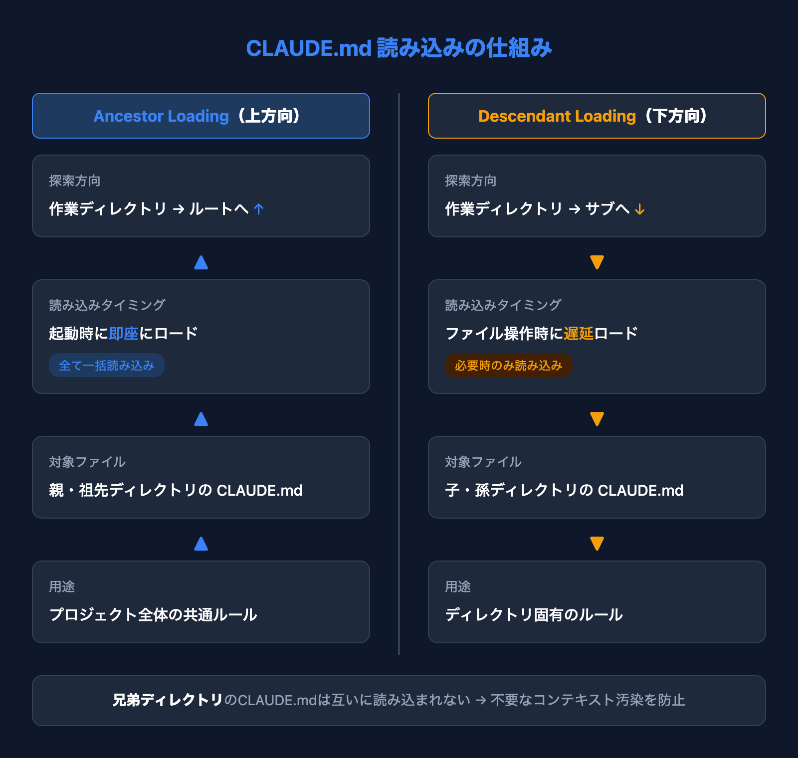 Claude Codeを起動すると、現在の作業ディレクトリから上方向に向かってすべてのCLAUDE.mdを読み込みます。ルートディレクトリのCLAUDE.md、その親ディレクトリのCLAUDE.md…という形で、全て起動時にロードされます。