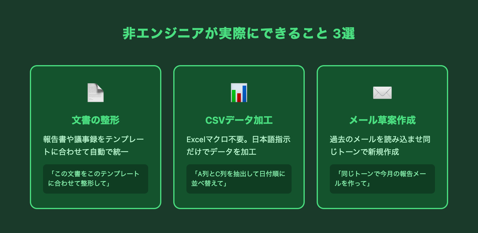 取引先への定型的な連絡メールの草案作成も、Claude Codeで効率化できました。過去のメールファイルを読み込ませて「同じトーンで、今月の報告メールを作って」と指示するだけです。ゼロから書くよりも圧倒的に速く、しかも品質が安定します。
