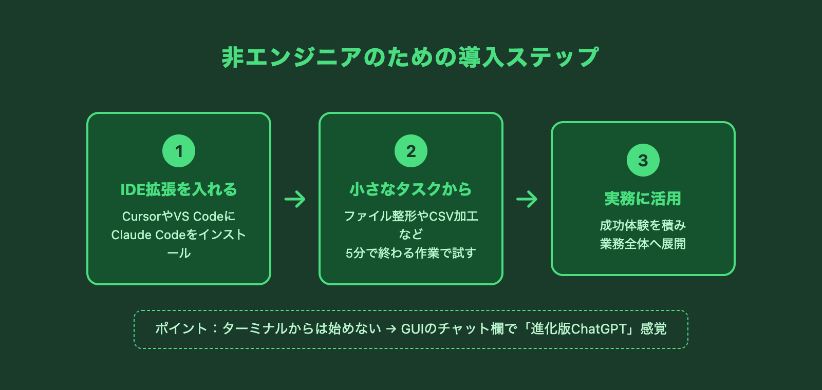 非エンジニアにClaude Codeを教える中で、最も重要だと感じたのが「始め方」の選択です。以下の3ステップで進めるのが最も成功率が高い方法でした。