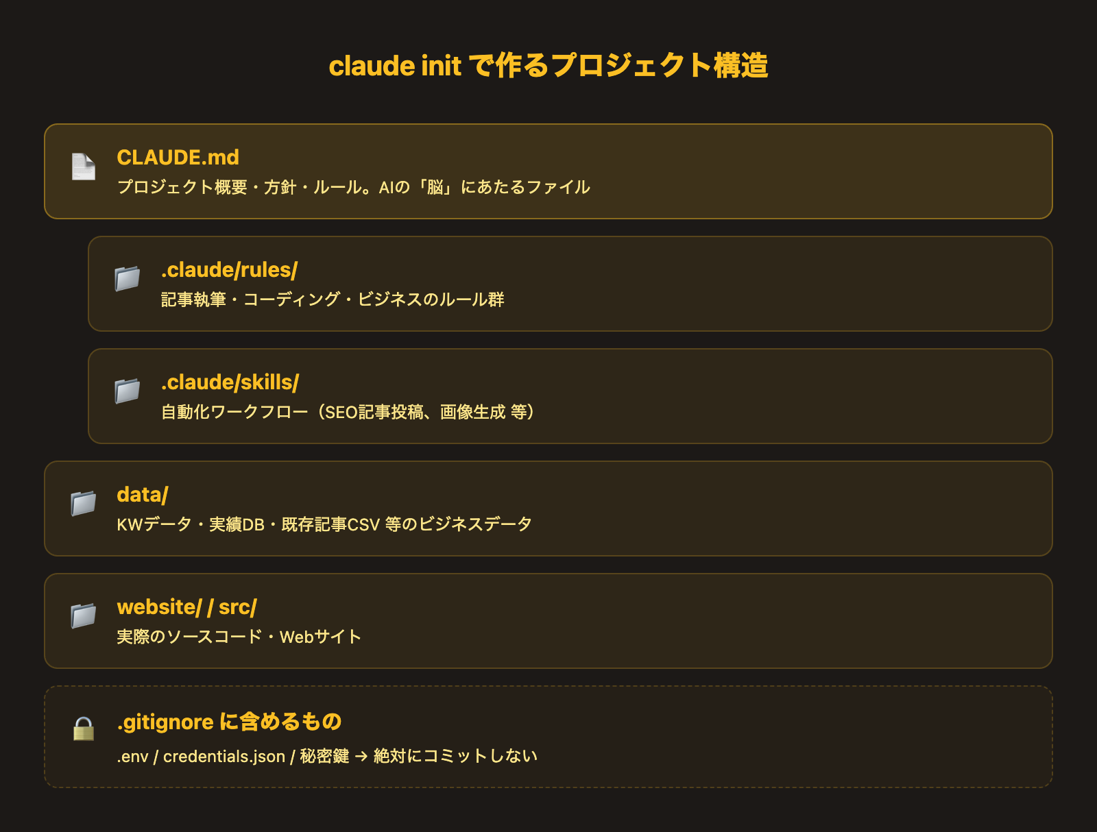 claude initを実行すると、Claude Codeが以下のような構造を自動生成します。