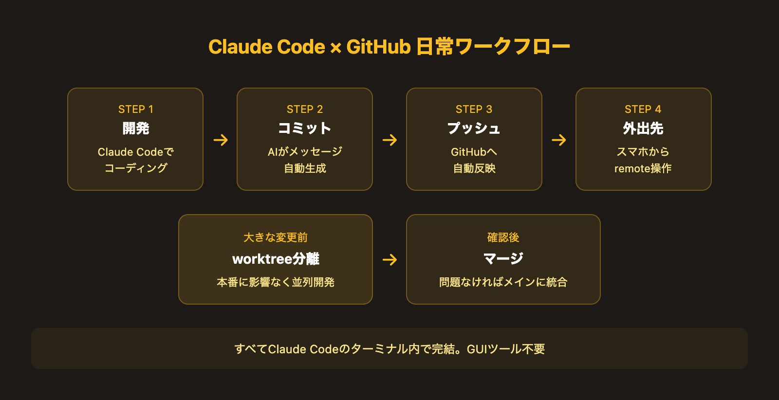 最後に、私が日常的に行っているClaude Code × GitHubの運用フローをまとめます。