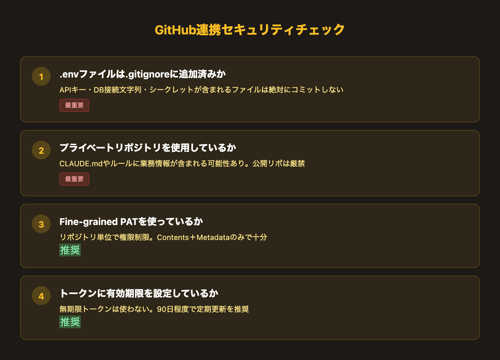 Claude CodeとGitHubを連携する際に、特に注意すべきセキュリティポイントを整理します。