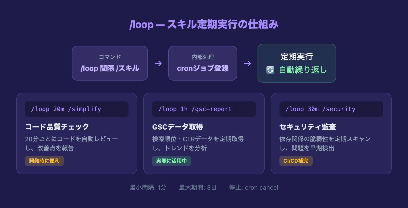 私はGSCデータの日次取得に/loopを活用しています。毎日Google Search Consoleから検索順位・キーワード・CTRデータを自動取得し、トレンド分析→記事戦略の意思決定に繋げています。PCを付けっぱなしにして定期実行する運用で、「自分が持っている資産(Webサイト)の状態を定期モニタリングする」用途に非常に使いやすいと感じています。