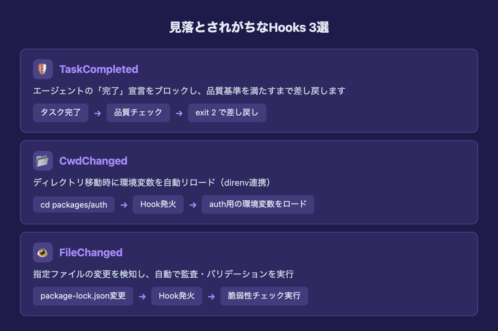 Hooksの中でも見落とされがちなのがTaskCompletedです。エージェントが「タスク完了」と判断した瞬間に発火し、exit code 2を返すとタスクを差し戻せます。