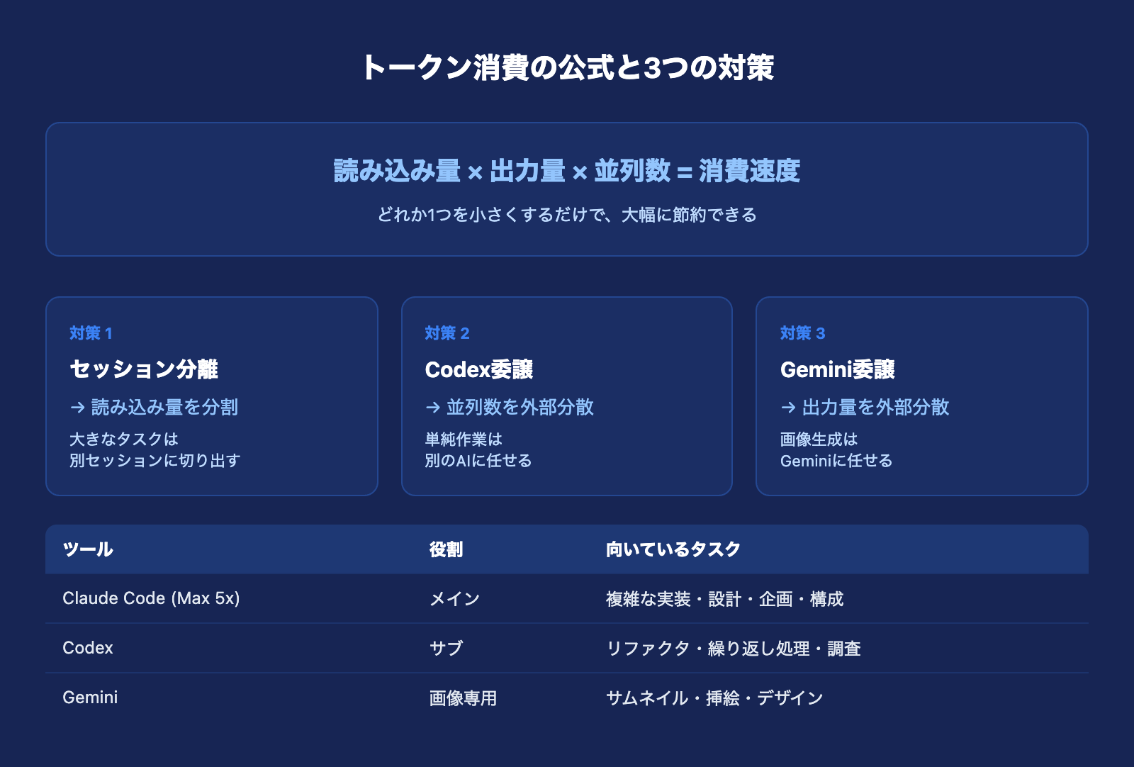 逆に言えば、この掛け算のどこかを小さくすれば、同じ作業量でもトークン消費を抑えられます。それが次の対策につながります。