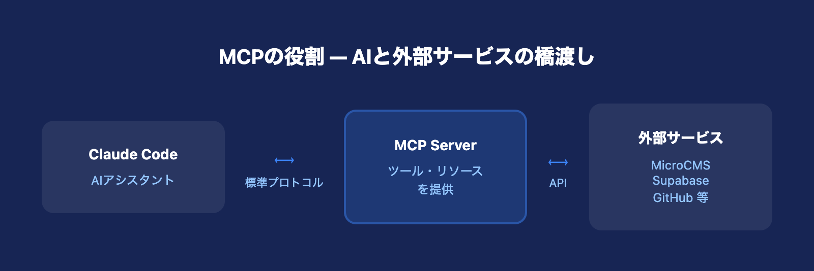 Claude Codeは単体でも強力ですが、MicroCMSやSupabaseなどの外部サービスと連携すると業務自動化の幅が一気に広がります。この連携を実現するのがMCP(Model Context Protocol)です。