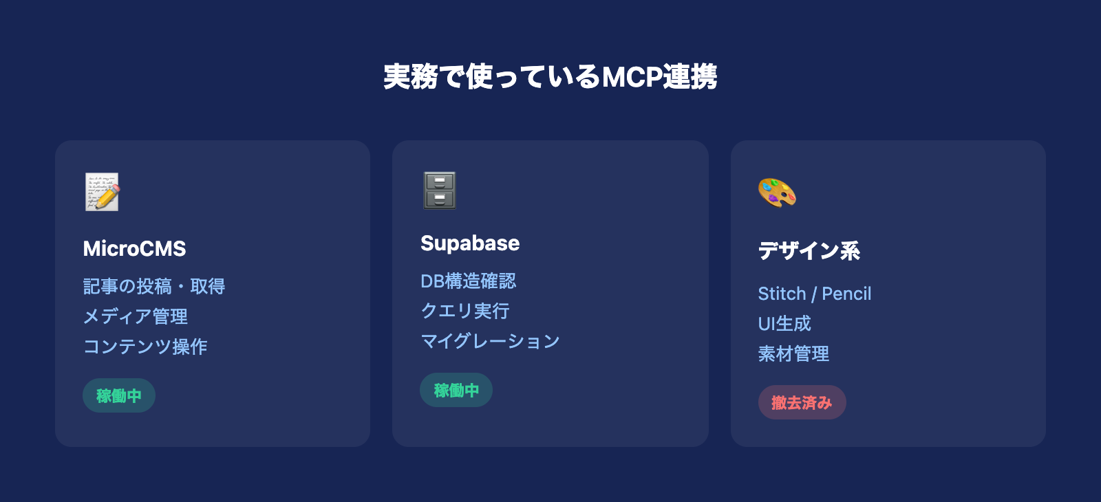 以前はStitchやPencilといったデザイン系のMCPサーバーも接続していました。しかし運用する中で、プロンプトやSkillsでデザインガイドラインを定義し、コード上でデザインを整える方がトータルの作業コストが下がると判断し、現在はデザイン系MCPは外しています。