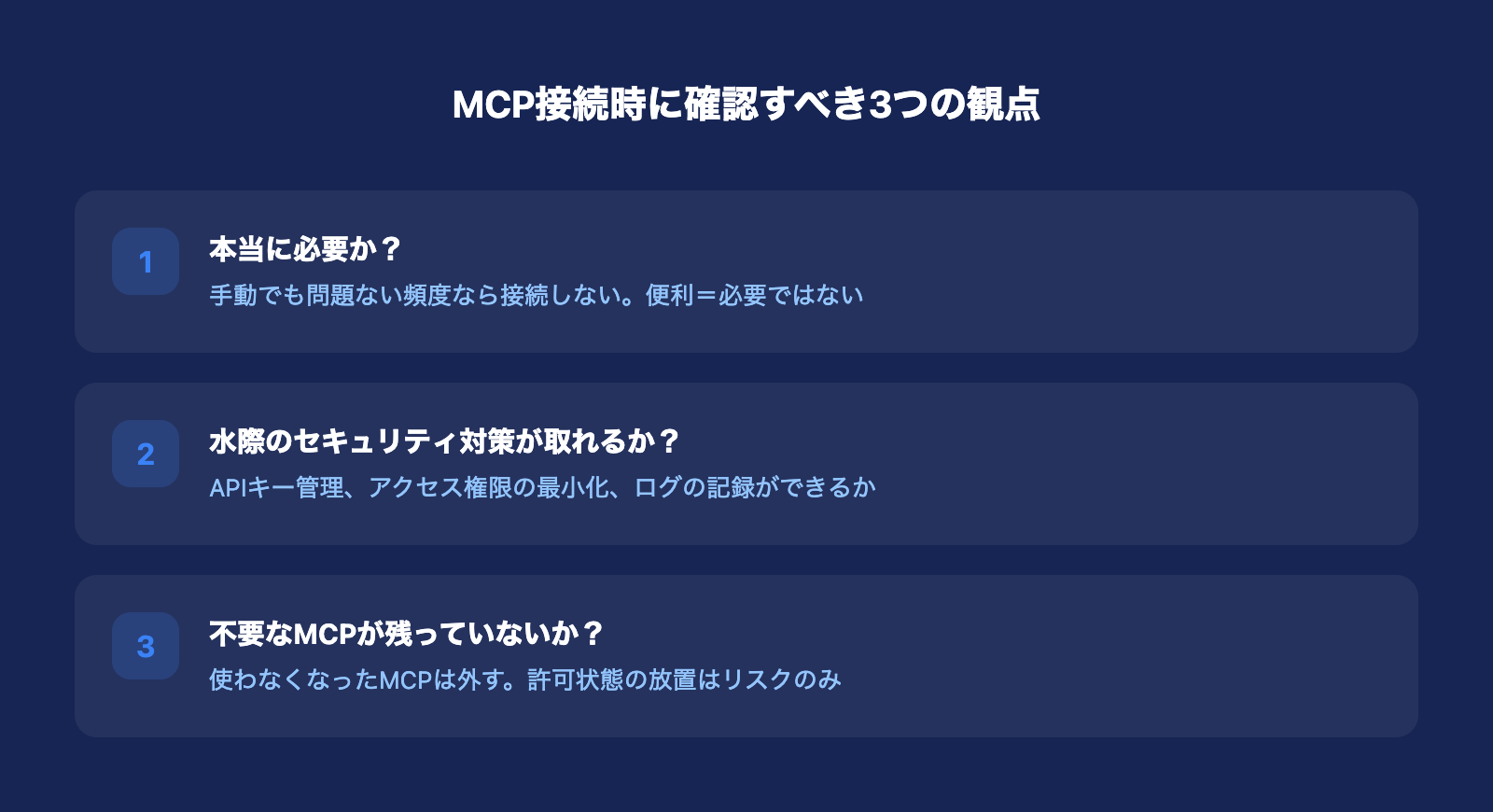 - 本当に必要か: そのMCPサーバーがないと業務が回らないのか。手動でも問題ない頻度なら接続しない