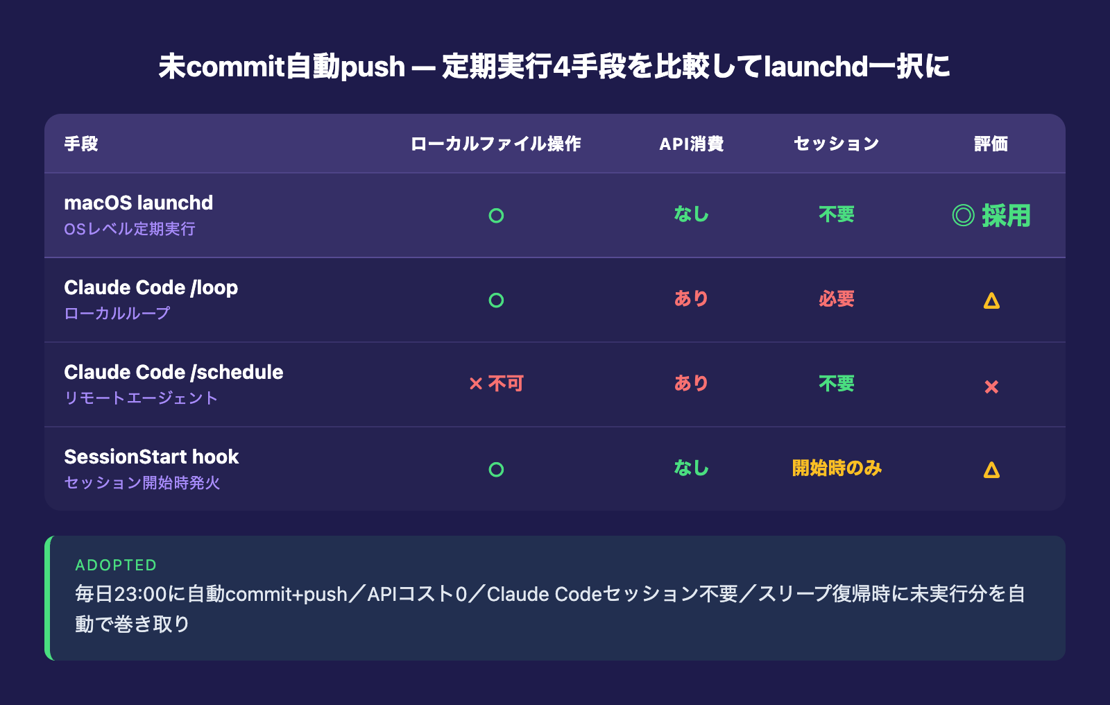結論として、ローカルの未commitファイルを自動でpushする用途にはlaunchd一択でした。APIコストゼロ、Claude Codeセッションも不要、スリープ中はスキップして復帰時に未実行分を走らせる挙動も、個人のMacbook運用に合っています。