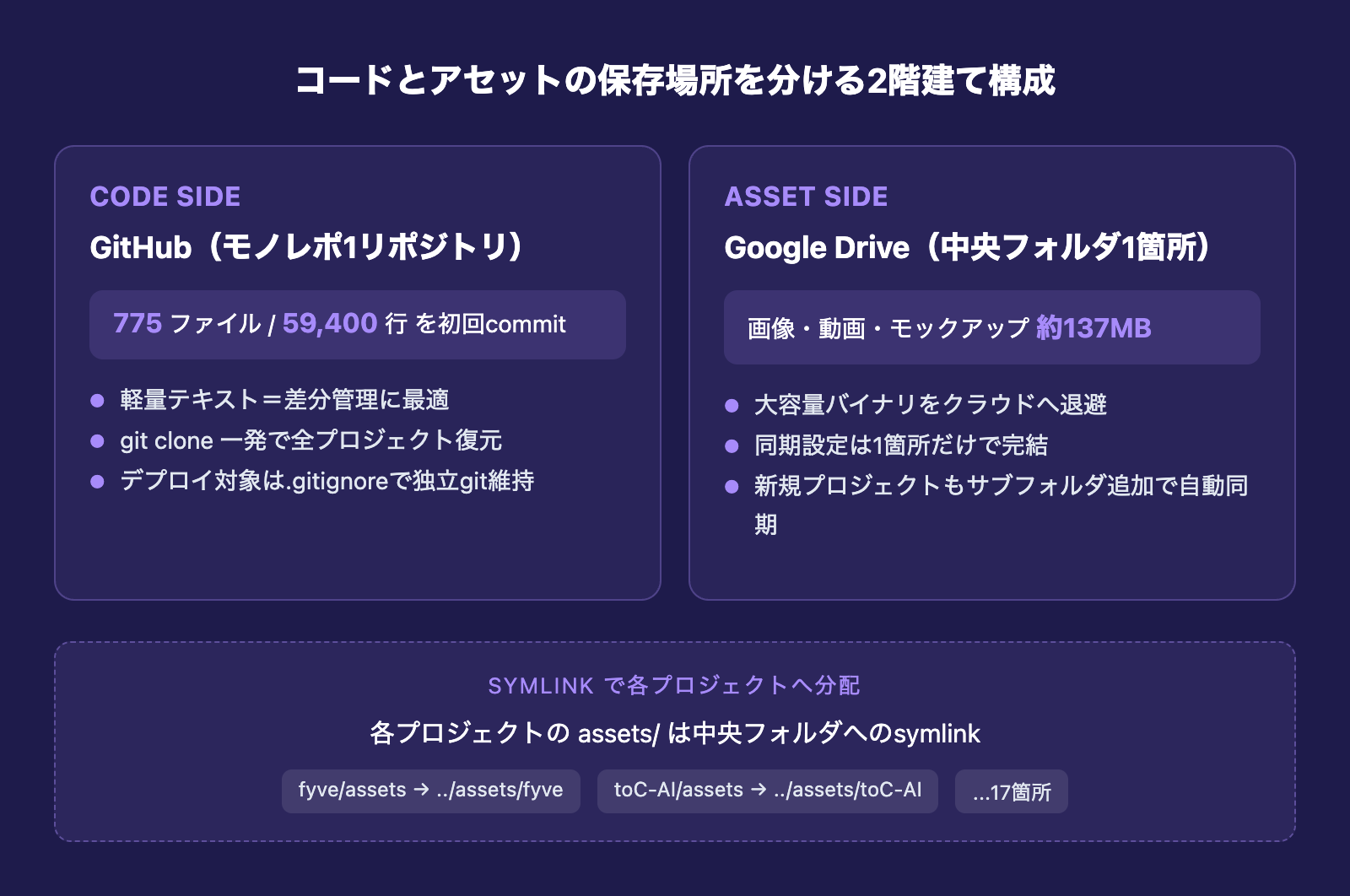 保管したいデータは性質が違います。コードは軽くて差分管理に向いているのでGitHubが最適、アセットは重くてバイナリなのでクラウドストレージが最適。両方の性質を1つのインフラで賄おうとするから無理が出ます。