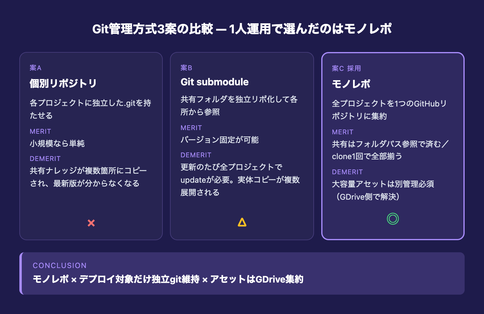 結論として、デプロイ対象だけ独立gitで切り離し、それ以外はモノレポにまとめるのがいちばんシンプルでした。