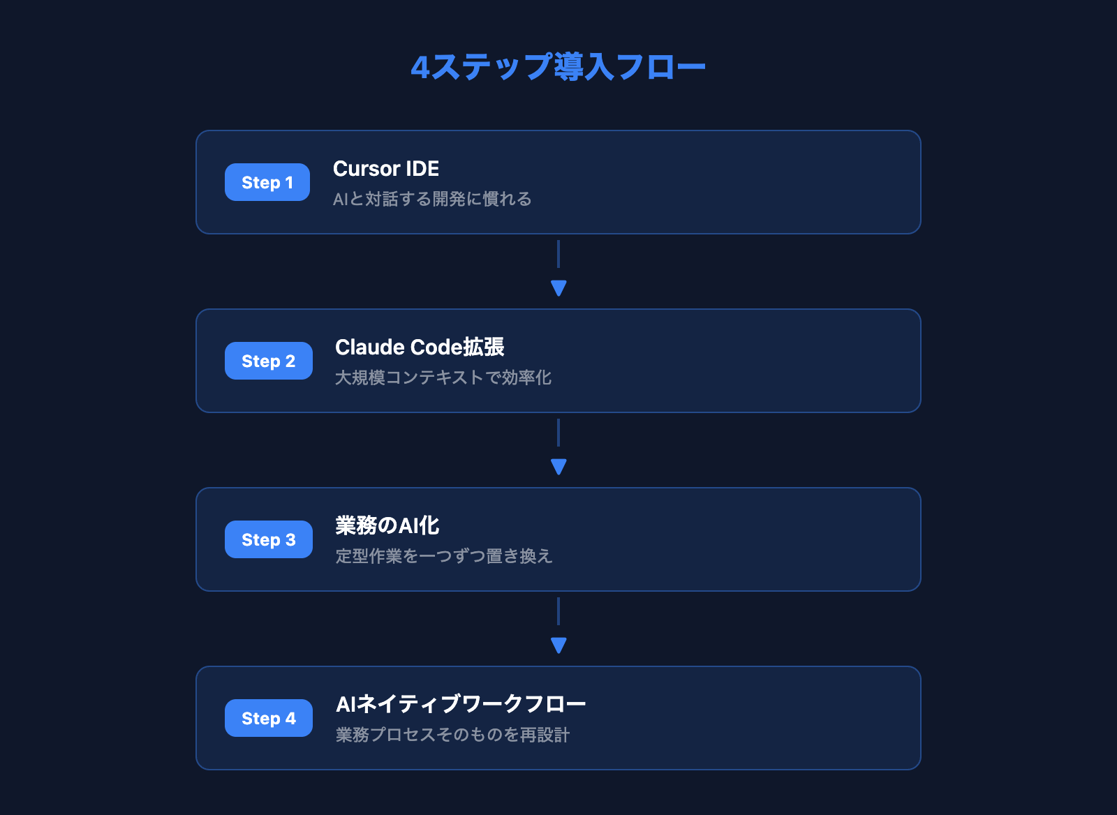 - 段階的に進める:Cursor → Claude Code拡張 → 業務のAI化 → AIネイティブワークフロー