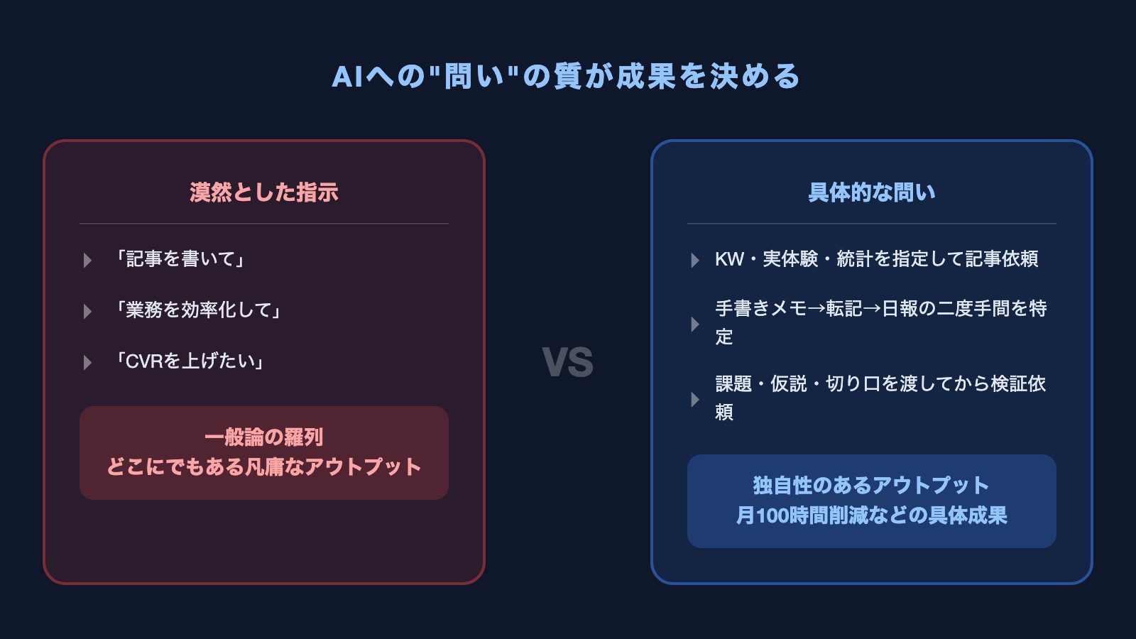 この具体的な課題定義をAIに渡したことで、「手書きメモを起点に日報・月次報告書・家族への手紙を自動生成する仕組み」という解決策が生まれ、結果として月100時間の業務削減を実現しました。