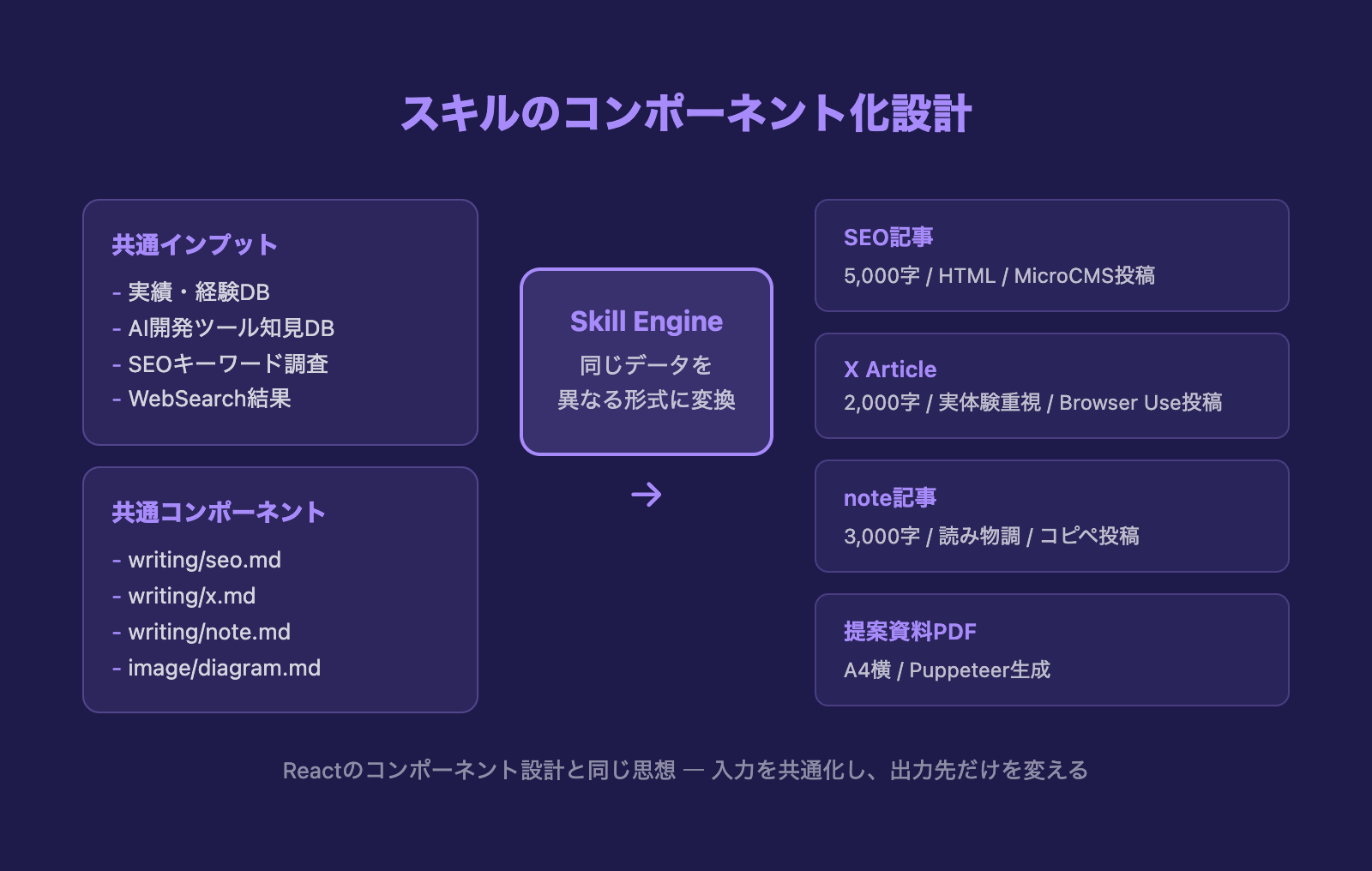 2026年4月に私が実装したのが、スキルのコンポーネント化設計です。これはReactのコンポーネント設計と同じ思想で、同じインプットから複数のアウトプットを書き分ける仕組みになっています。