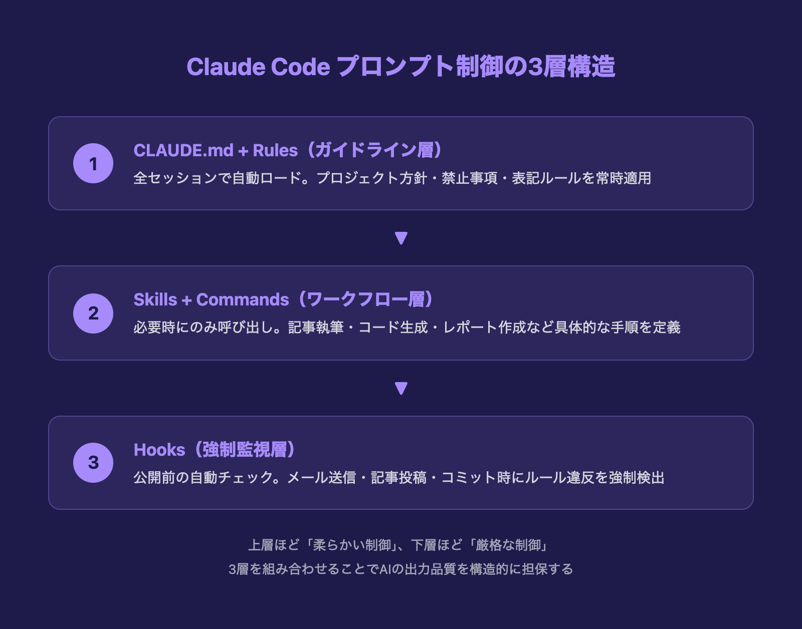 - 第3層 Hooks: 公開前の強制チェック。LLMの判断に依存しない品質保証