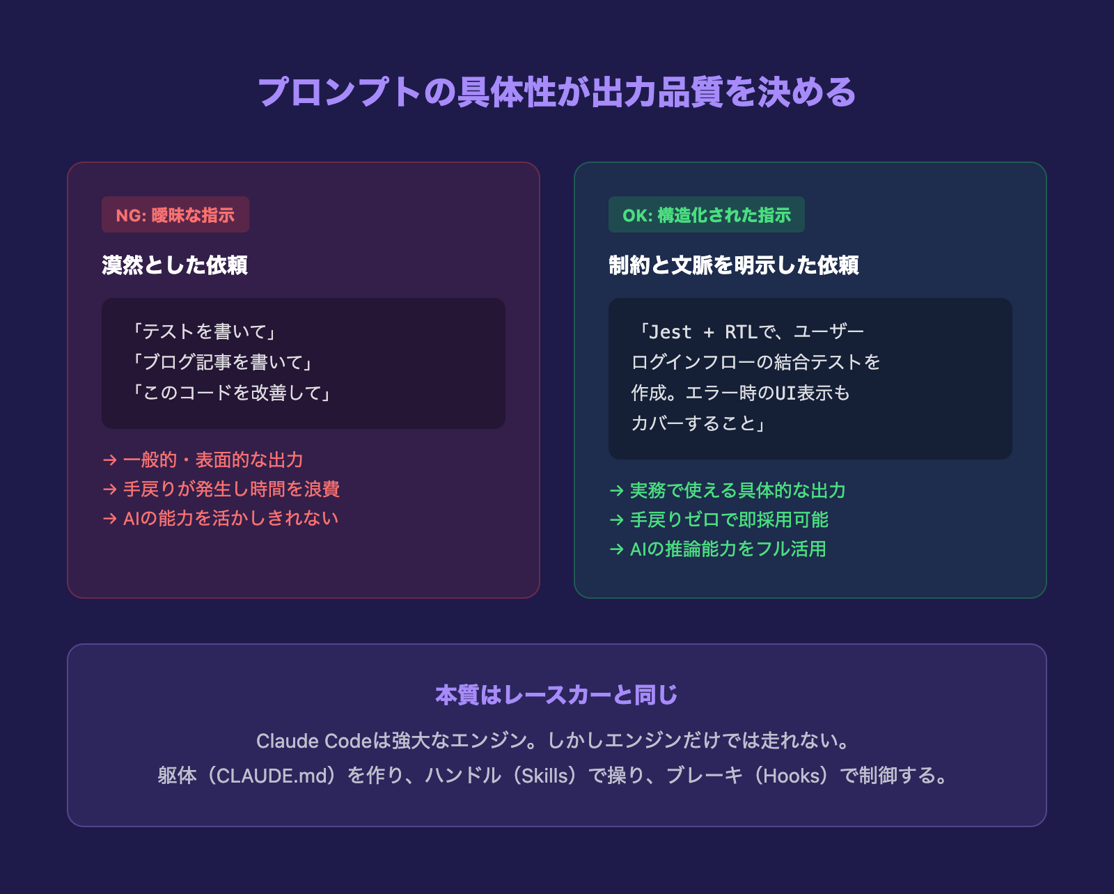 「ブログ記事を書いて」「このコードを改善して」といった曖昧な指示では、AIは一般的で表面的な出力しか返せません。これは人間の部下に「いい感じにやっといて」と丸投げするのと同じです。