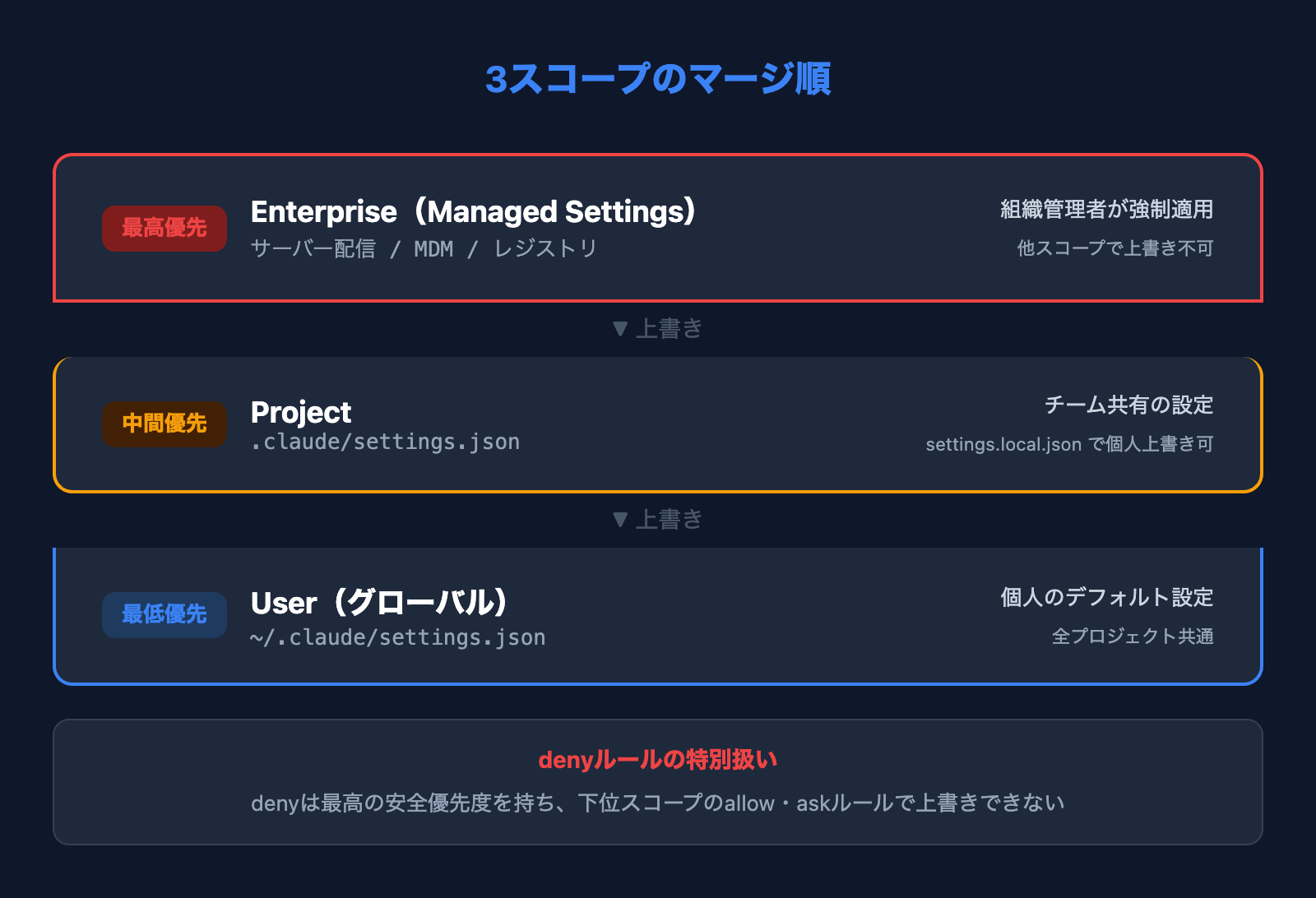 重要なのは、denyルールは最高の安全優先度を持つという点です。下位スコープのallowやaskルールで上書きできません。
