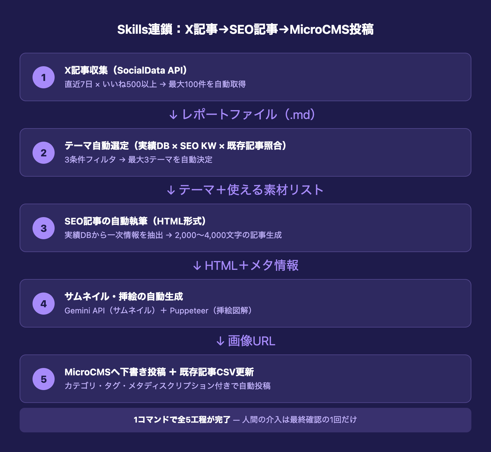 この連鎖スキルにより、「Xでのトレンド調査→記事企画→執筆→画像制作→CMS投稿」という本来なら半日かかる工程が、1コマンドで完了します。
