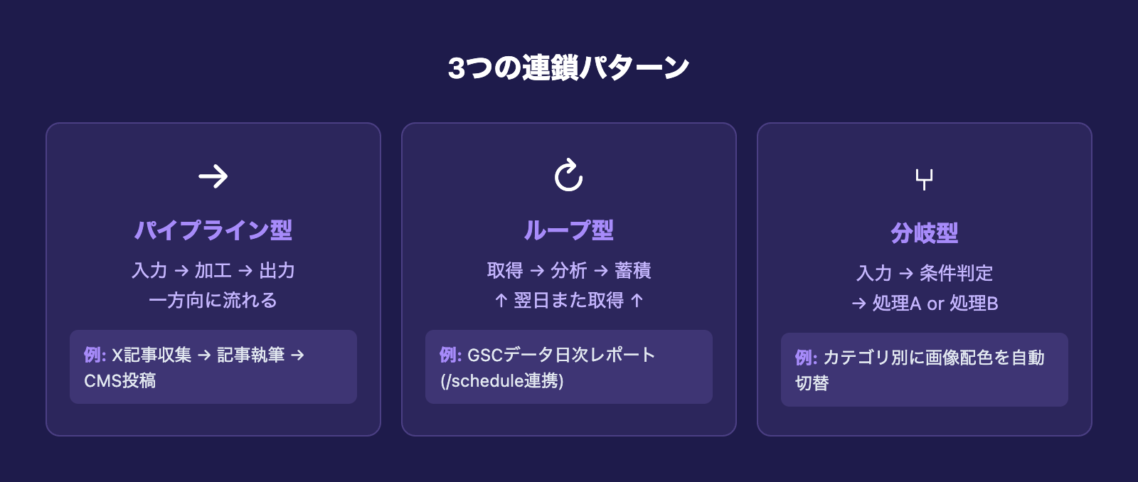データ取得 → 加工 → 出力。最もシンプルな形で、SEO記事の自動生成がこれに該当します。初めてスキル連鎖を作るなら、まずこの型から始めるのがおすすめです。