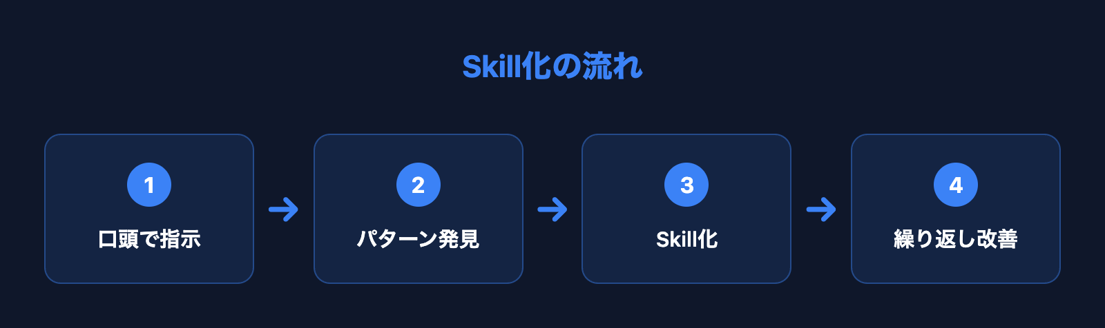 田嶋の経験では、Skillが実用レベルに達するまでに3〜5回の改善サイクルが必要でした。特に「想定外のパターンへの対応」と「出力品質の安定化」に時間をかけています。