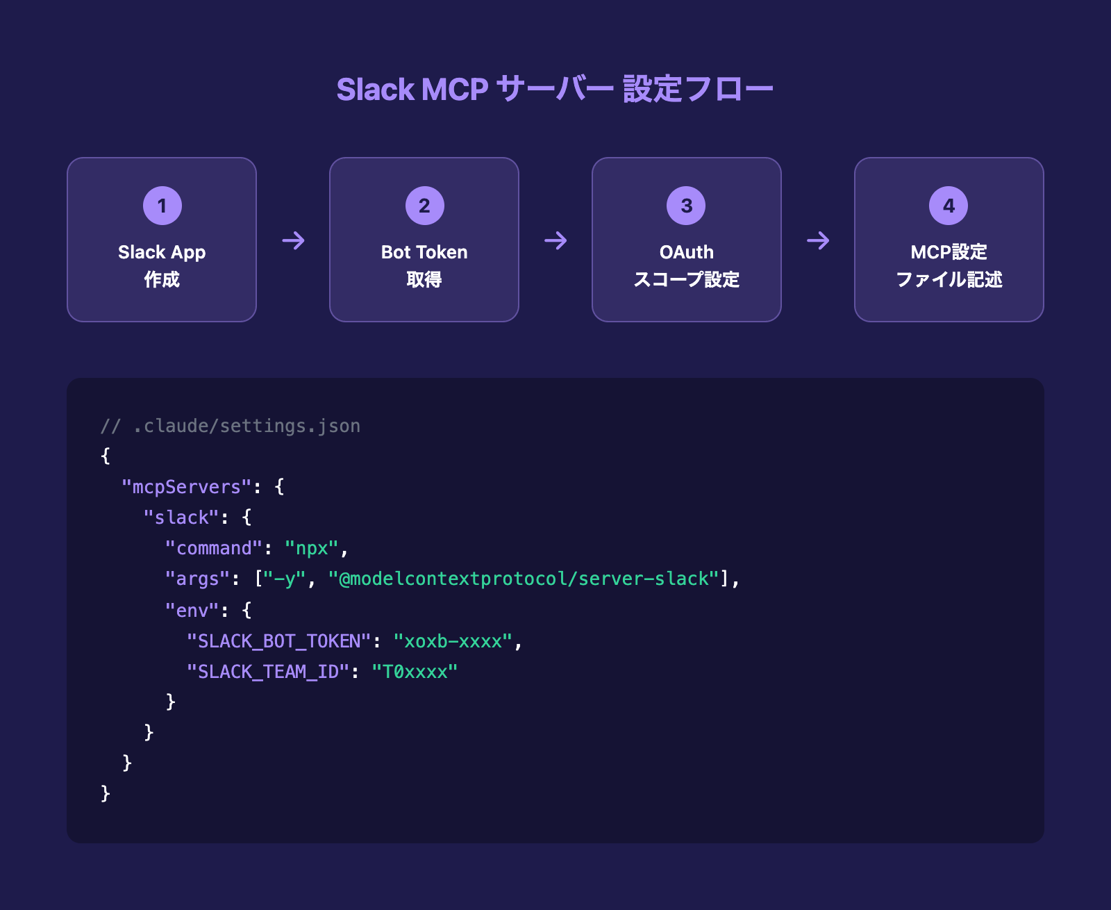 {"mcpServers":{"slack":{"command":"npx","args":["-y","@modelcontextprotocol/server-slack"],"env":{"SLACK_BOT_TOKEN":"xoxb-your-token","SLACK_TEAM_ID":"T0XXXXXXX"}}}}特定のチャンネルだけに制限したい場合は、SLACK_CHANNEL_IDSにカンマ区切りでチャンネルIDを指定します。