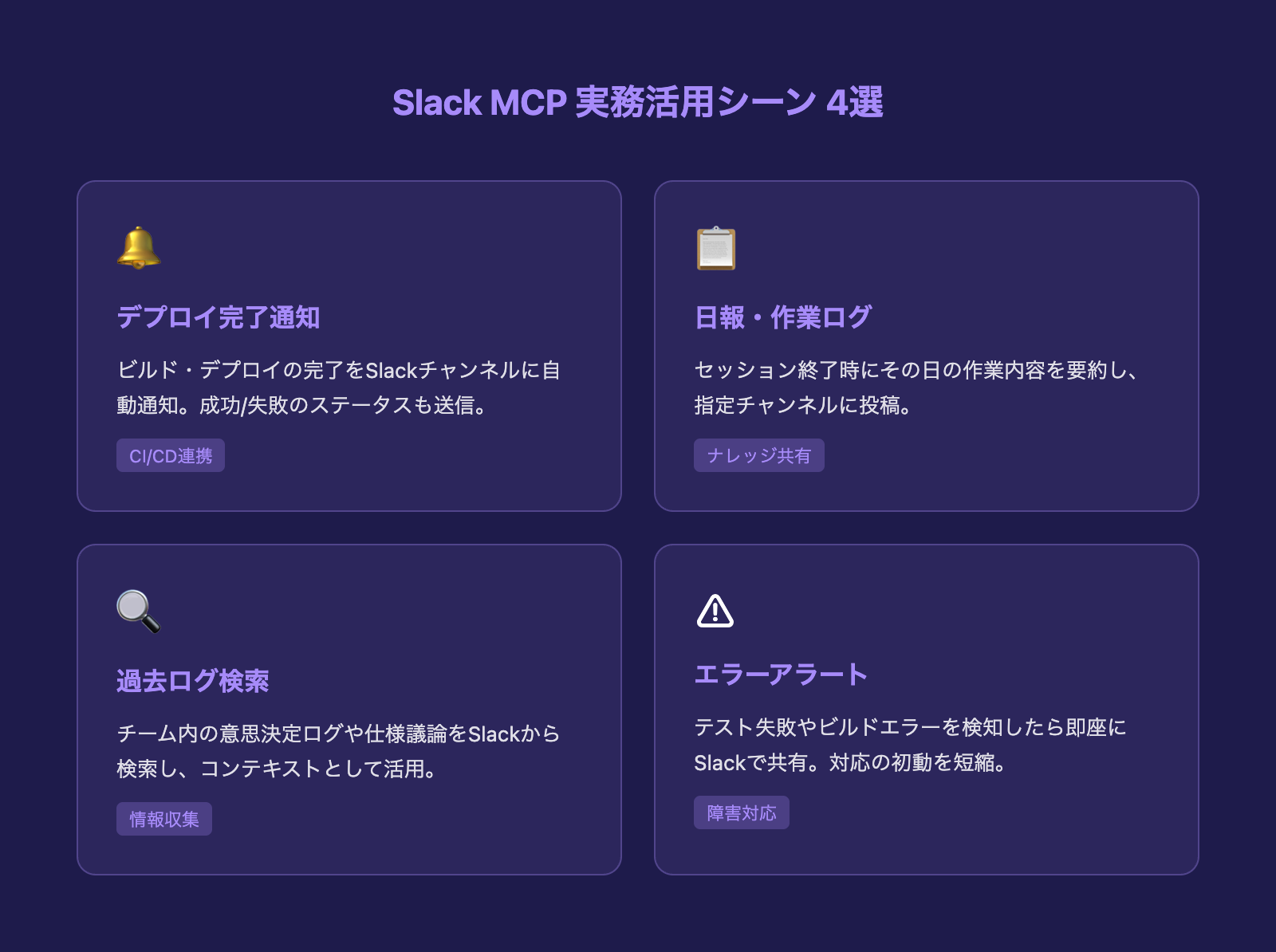 Claude Codeを業務で使い込んでいくと、「この作業結果をSlackに通知できたら」「チームの議論ログをコンテキストに渡せたら」と感じる場面が増えてきます。そのニーズに応えるのが、Slack MCPサーバーです。