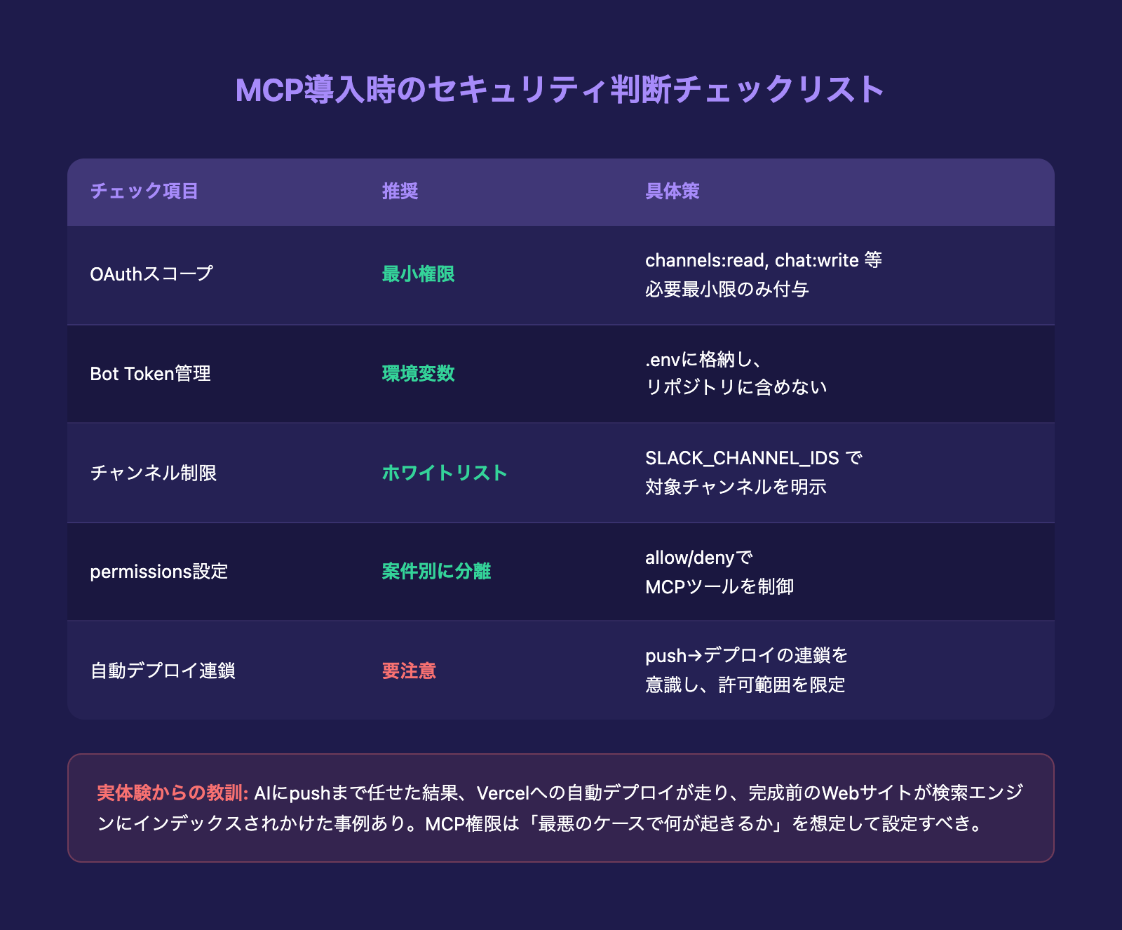 MCP権限を設計するときは「最悪のケースで何が起きるか」を必ず想定すべきです。Slack MCPも同様で、誤ったチャンネルへの投稿、機密情報を含むメッセージの送信など、「AIが間違えたときのダメージ」を事前に見積もっておきます。