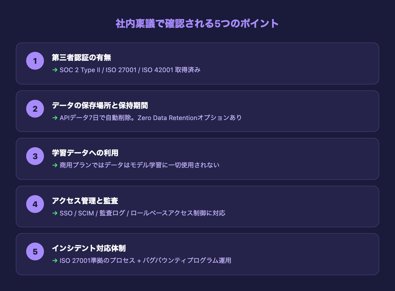 社内稟議でAIツールの導入を通すには、「なんとなく安全そう」では不十分です。SOC 2やISO 27001といった国際的なセキュリティ認証の有無、データの取り扱いポリシー、監査ログの仕組みなど、具体的な根拠が求められます。