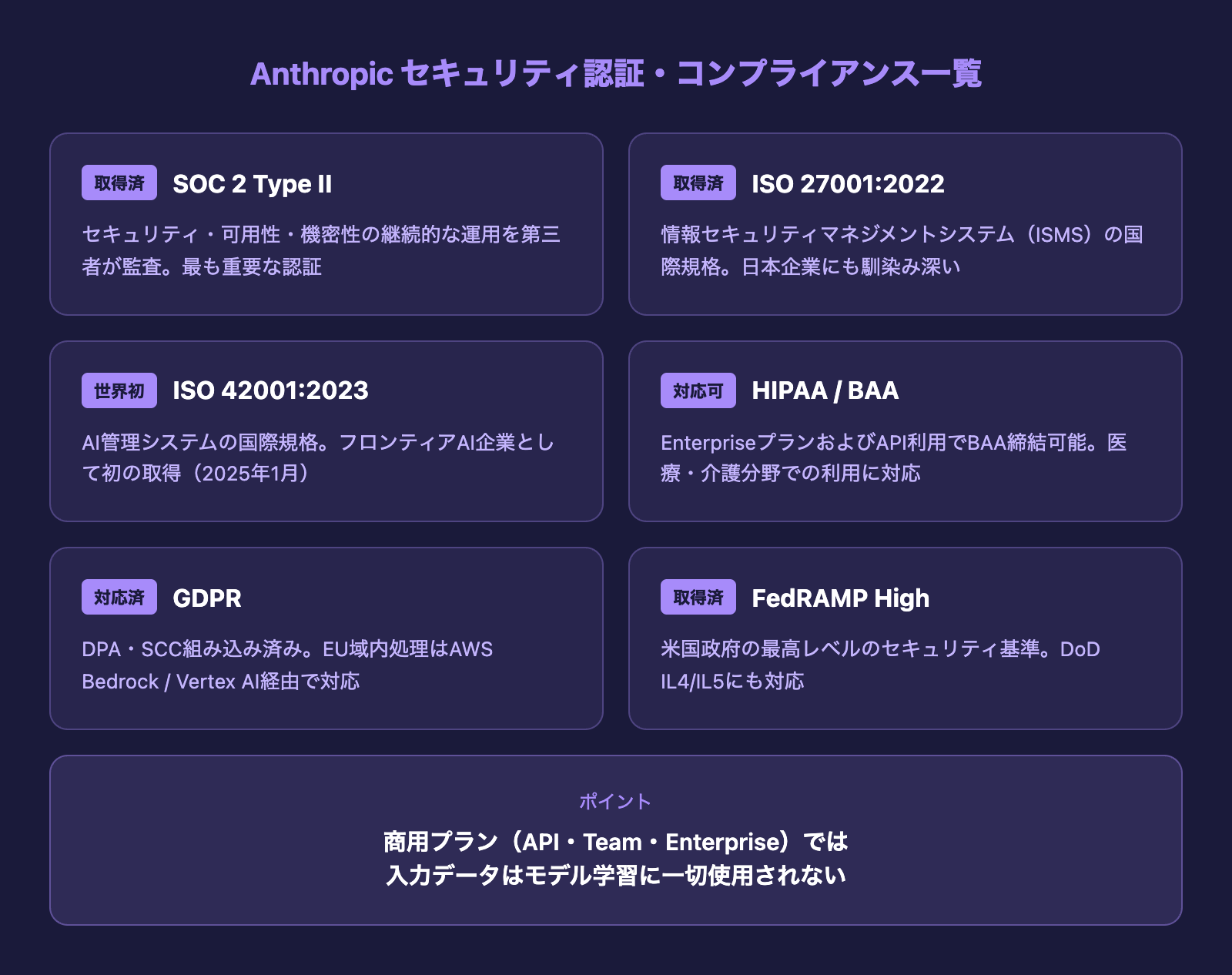 SOC 2 Type II、ISO 27001:2022、ISO 42001:2023を取得済み。詳細はAnthropic Trust Portalで確認可能。SOC 2 Type IIレポートはNDA締結により閲覧可能です。