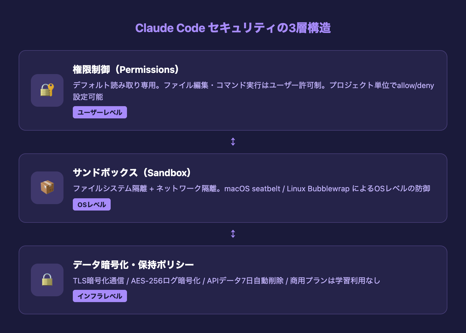認証はAnthropicの組織としてのセキュリティ体制を証明するものですが、Claude Code自体にも複数のセキュリティ機能が実装されています。