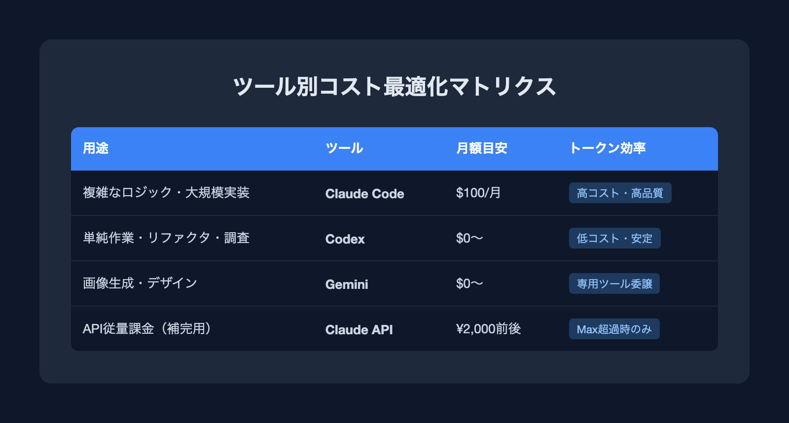 - Claude Code: 複雑なロジック、大規模な実装、メインの業務タスク