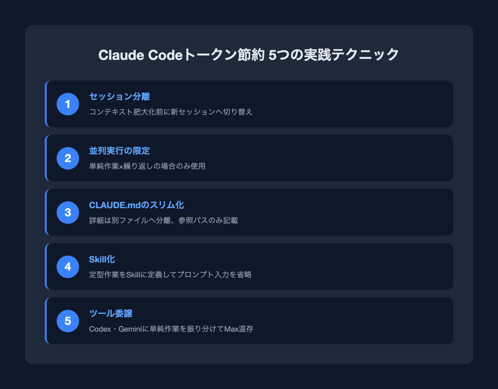 毎回長いプロンプトを書くことは、それ自体がトークン消費につながります。定型作業のSkill化は、再現性向上とトークン節約を同時に達成できる有効な手段です。