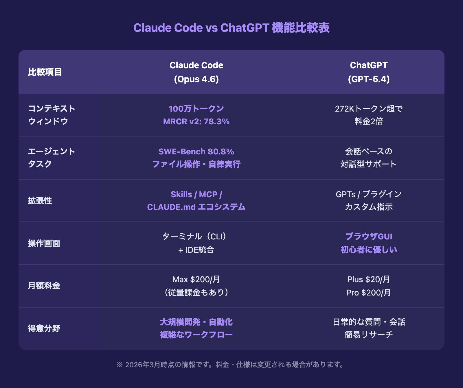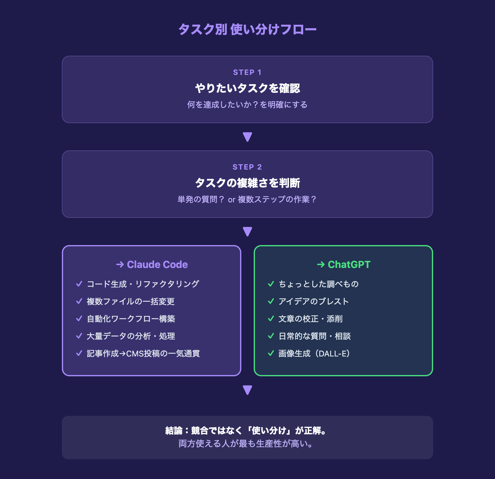Claude CodeとChatGPTは競合関係ではありません。複雑な作業を自動化したいならClaude Code、手軽に質問・相談したいならChatGPT。目的に応じて両方使える人が、最も生産性が高いと3年間の経験から断言します。