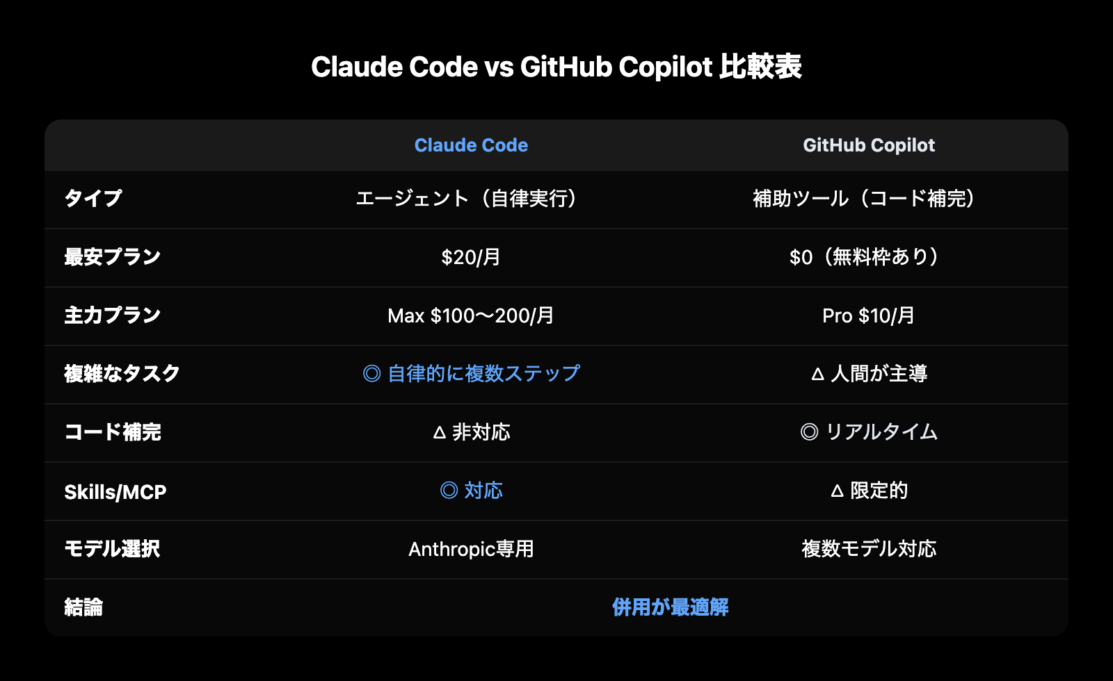 - GitHub Copilotは「補助ツール」、Claude Codeは「エージェント」。カテゴリが異なる