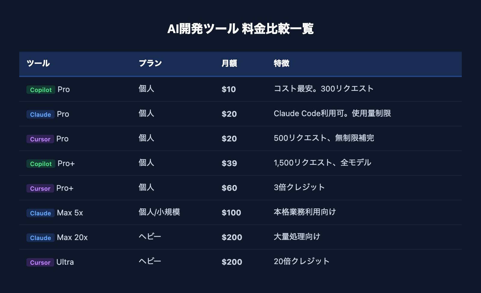 - コスト最優先: Pro $10/月は最安。300リクエスト付き