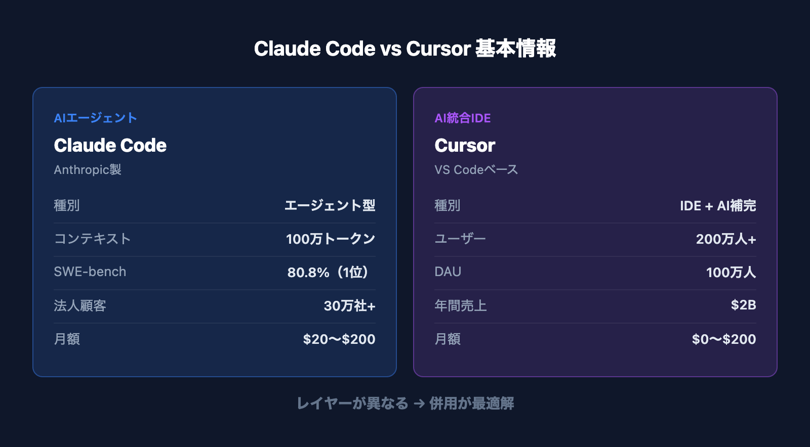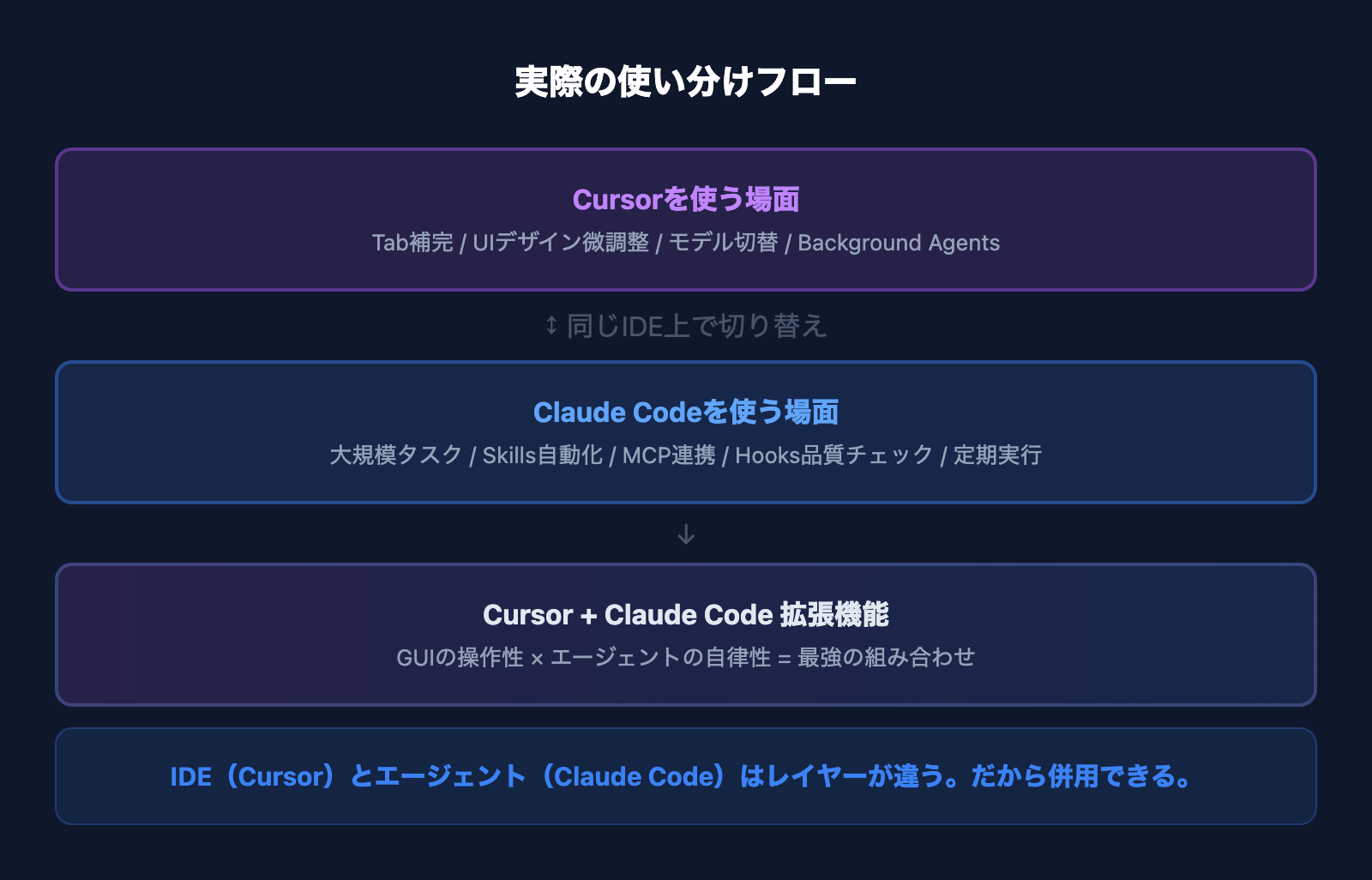 Claude CodeとCursorはレイヤーが異なるツールです。CursorはIDE(開発環境)、Claude Codeはエージェント(自律型AI)。だからCursorのIDE上でClaude Codeを使うという併用が成り立ちます。