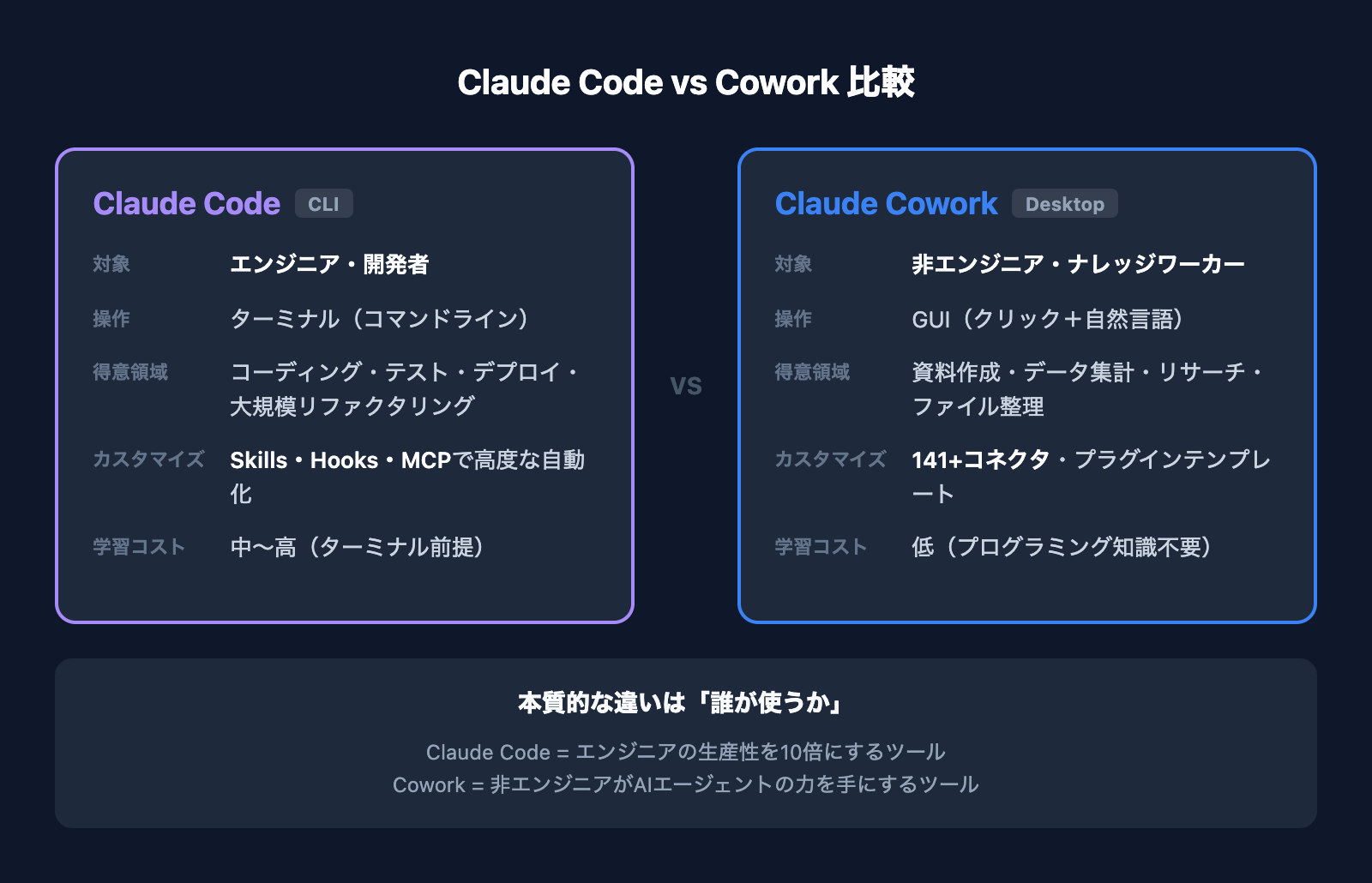 本質的な違いは「誰が使うか」です。Claude Codeはエンジニアの生産性を10倍にするツール。Coworkは、エンジニアではない人がAIエージェントの力を初めて手にするためのツールです。