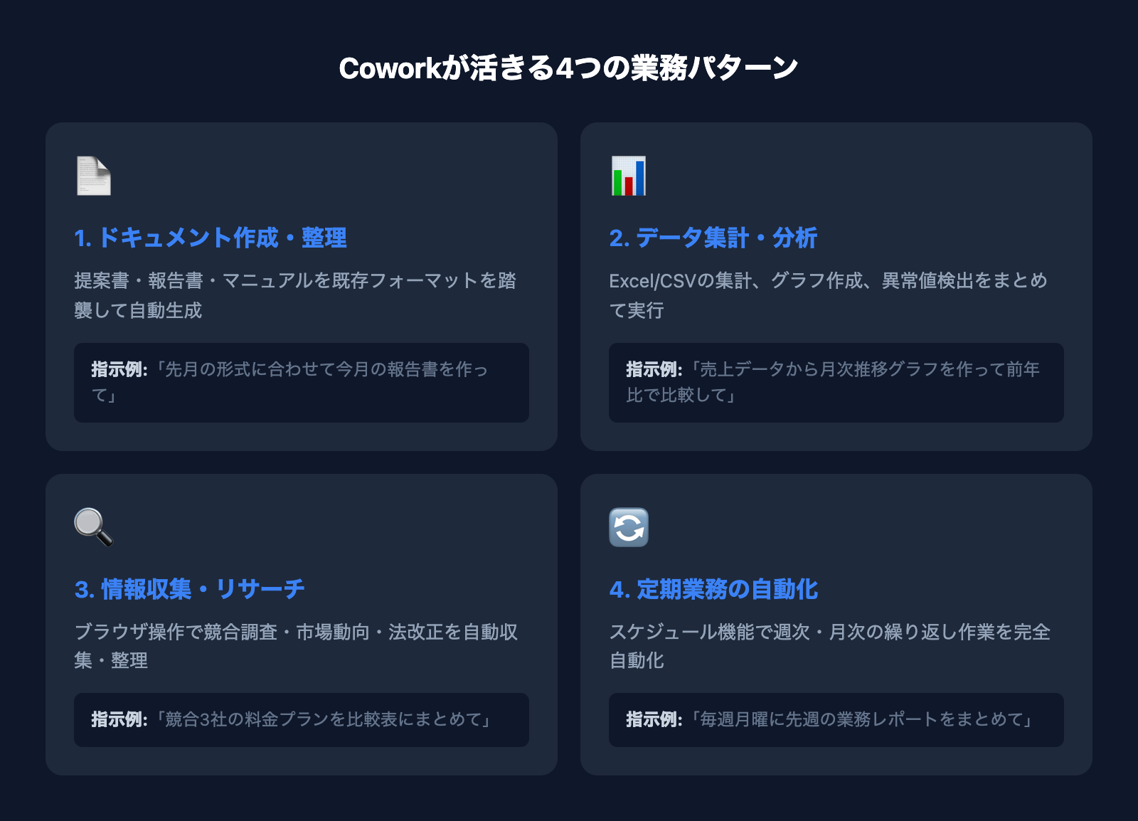 私のクライアントの多くは中小企業の経営者や管理者です。その視点で、Coworkが特に活きる業務パターンを挙げます。