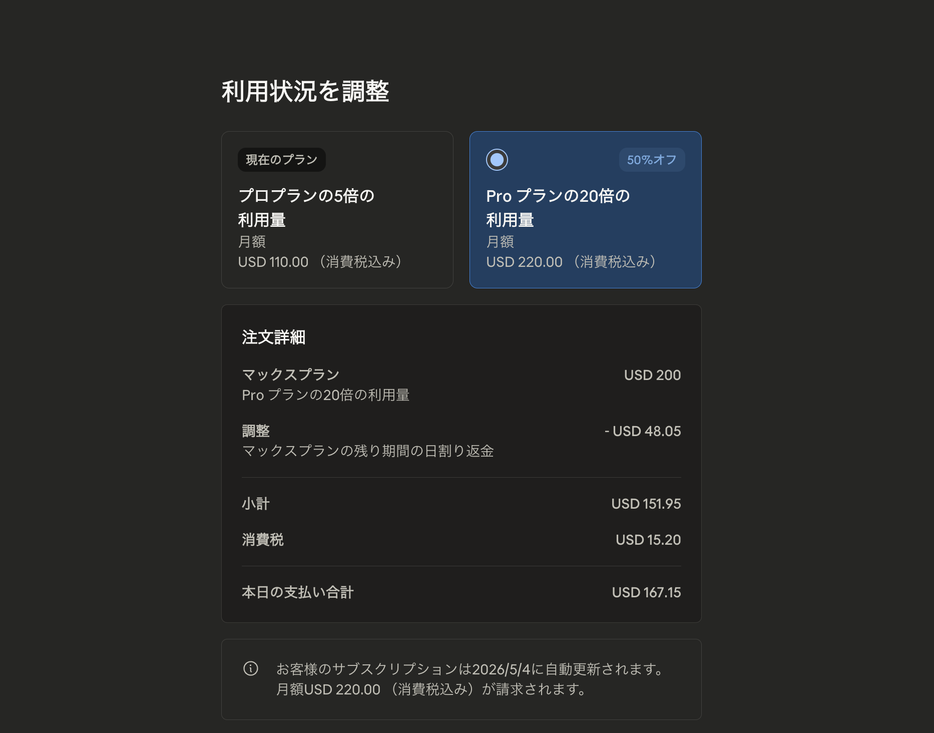 また、画面下部に「お客様のサブスクリプションは2026/5/4に自動更新されます」と表示されている通り、次回更新日は変更日から1ヶ月後にリセットされます。翌月からは通常の月額$220(税込)が請求されます。