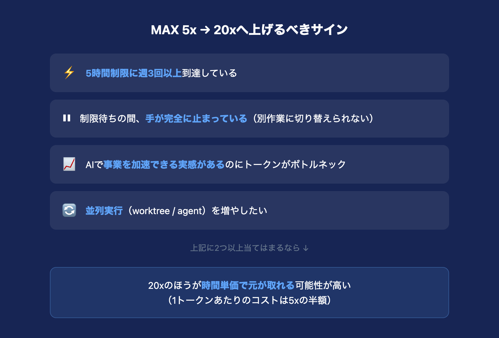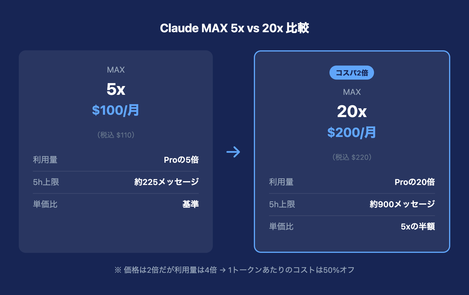 - MAX 5xと20xでは1トークンあたりのコストが半額になるため、制限に頻繁に当たるなら20xのコスパが圧倒的に良い