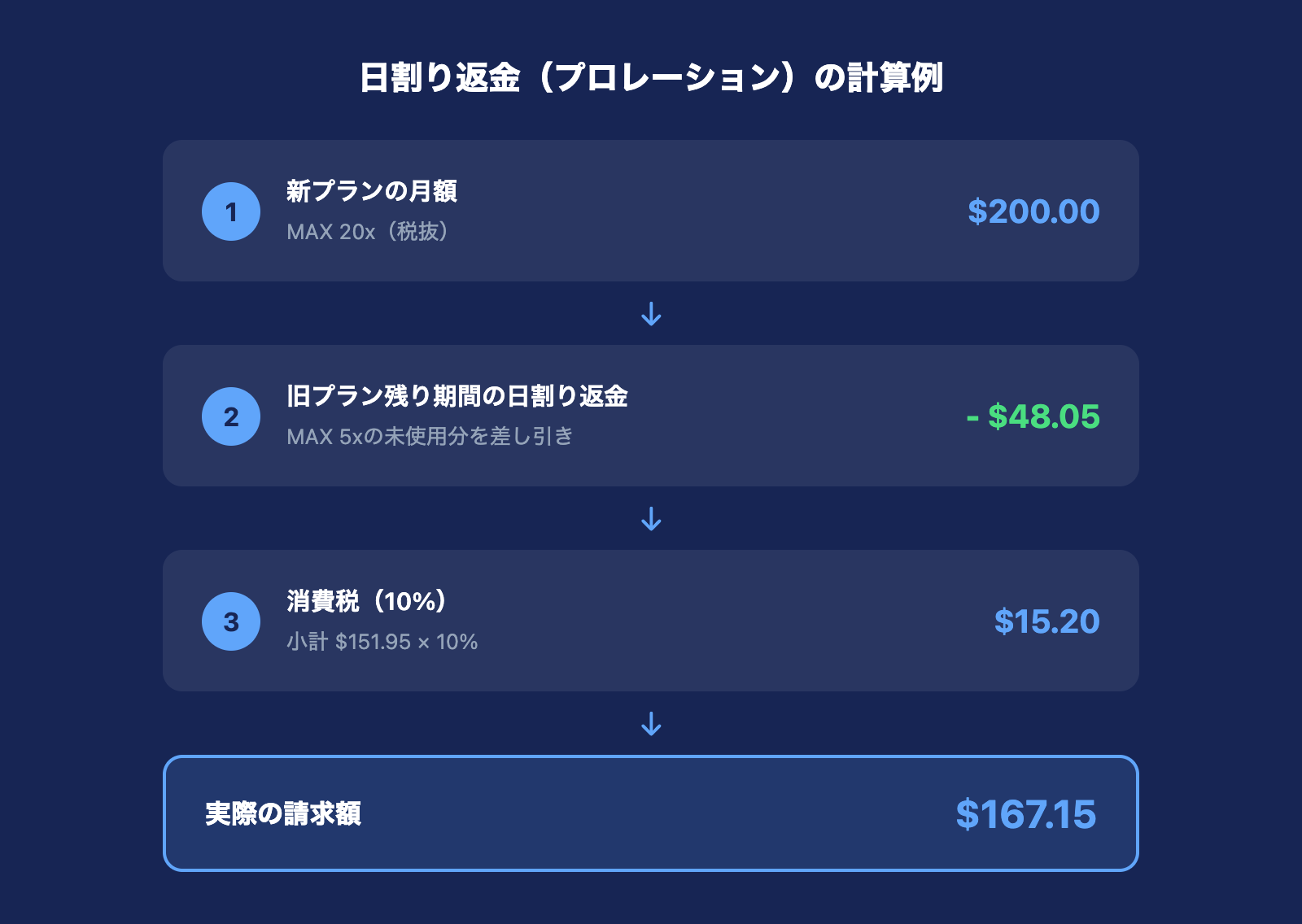 この仕組みはPro→MAXへのアップグレードだけでなく、MAX内でのティア変更(5x→20x)にも同様に適用されます。