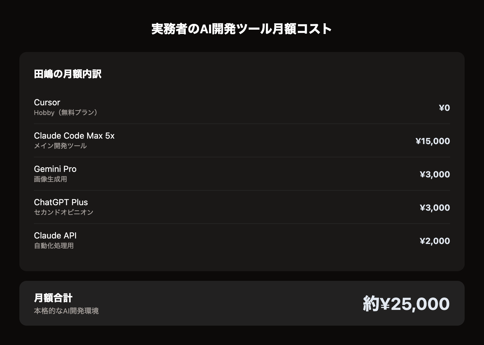 私の場合、AI開発ツールの月額コストは合計約25,000円です。