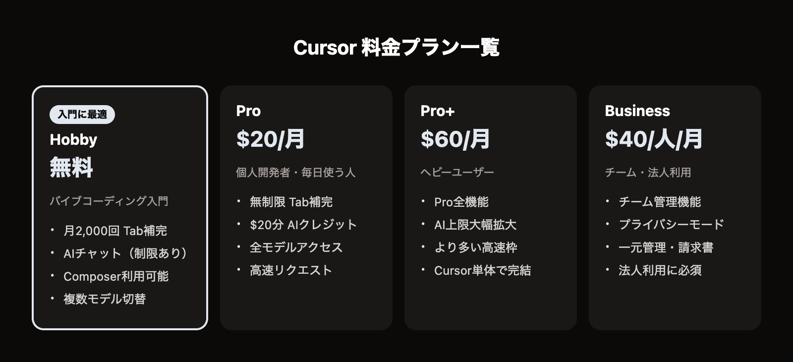 Cursor料金プラン比較|無料・Pro・Businessの違いと選び方