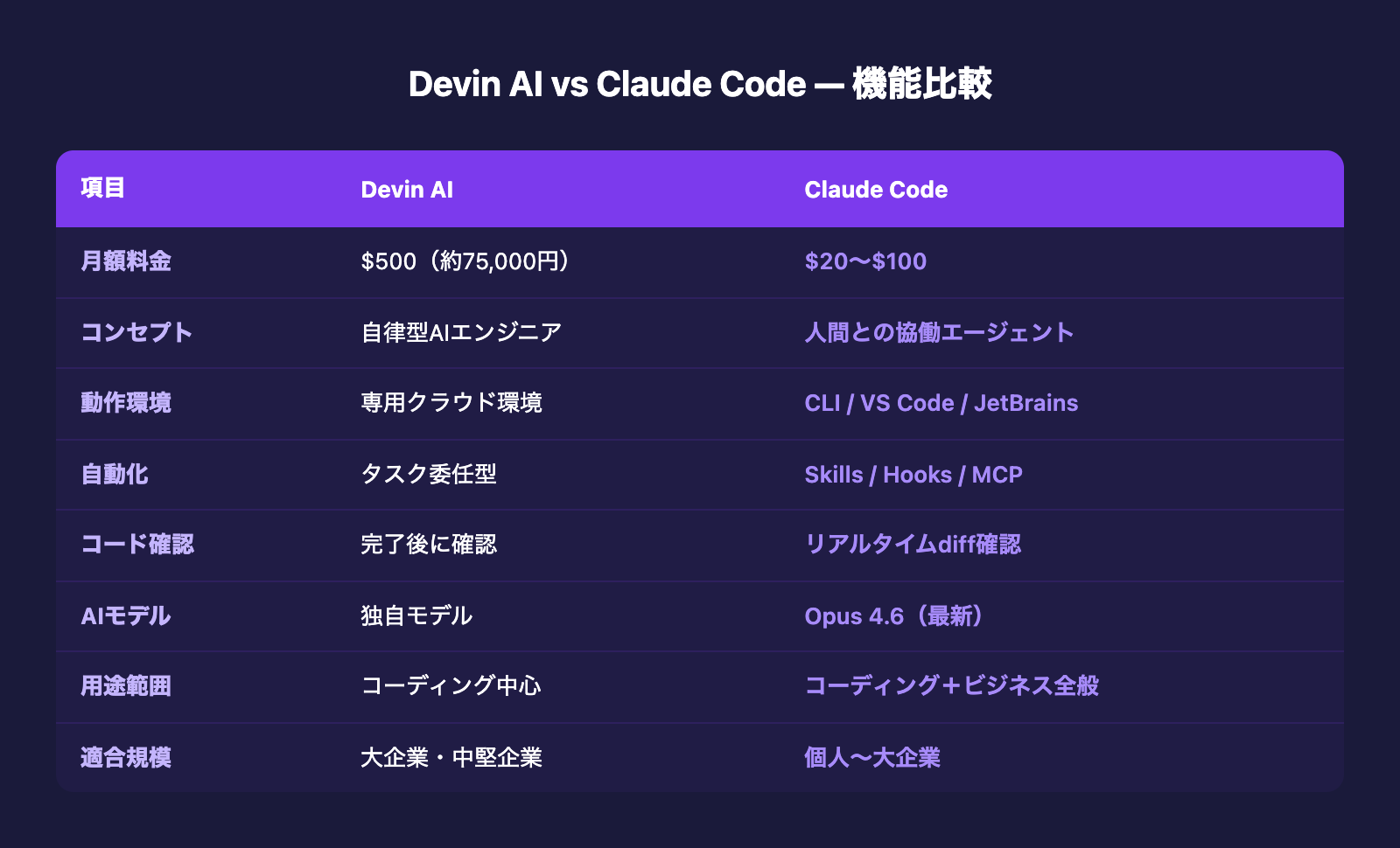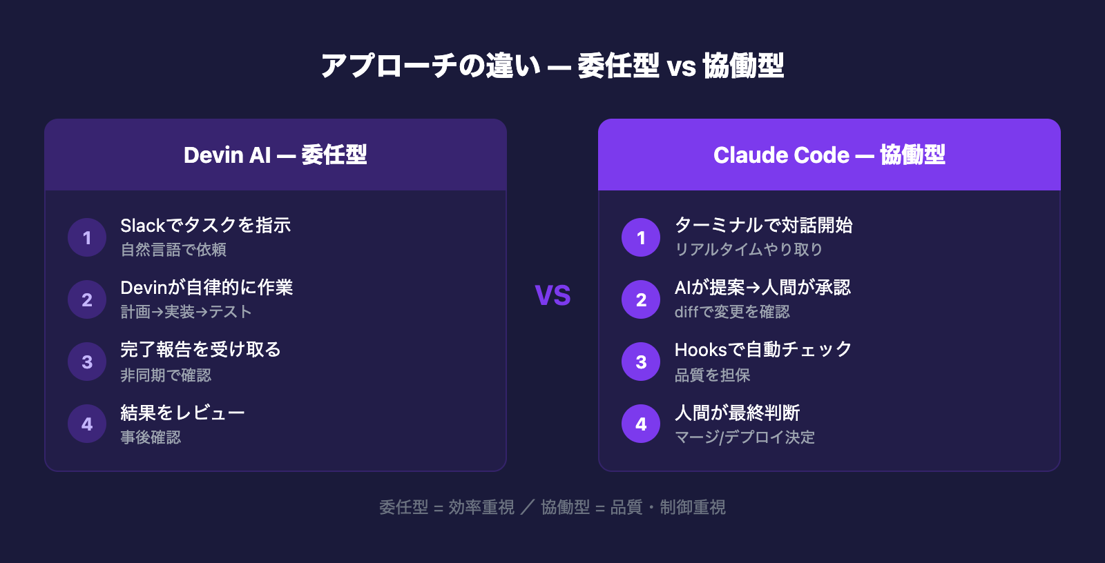 Devin AIとClaude Codeは、どちらもAIコーディングツールですが、根本的なコンセプトが異なります。