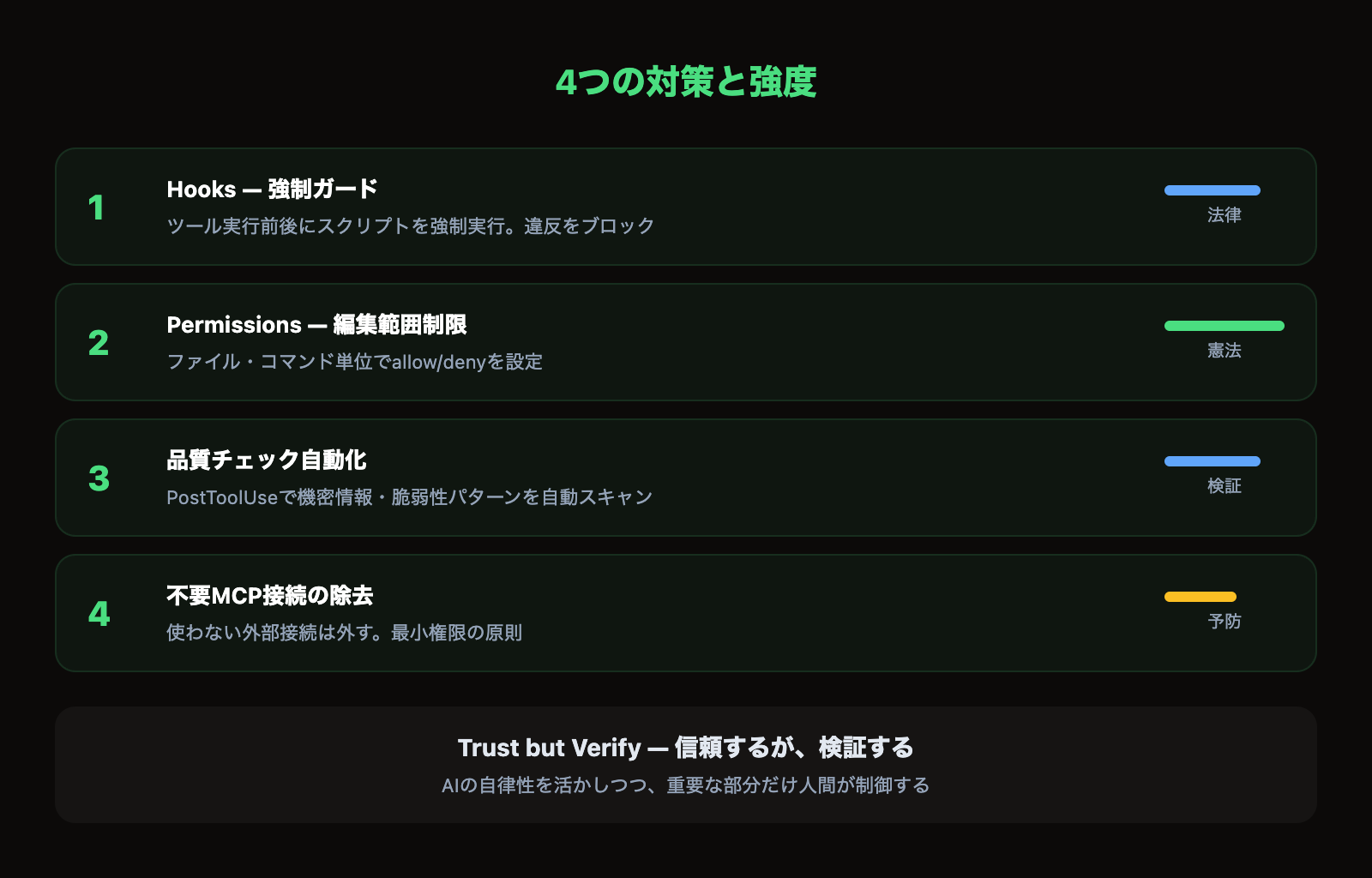 バイブコーディングのセキュリティ対策は、AIの自律性を活かしつつ、重要な部分だけ人間が制御する仕組みを作ることです。