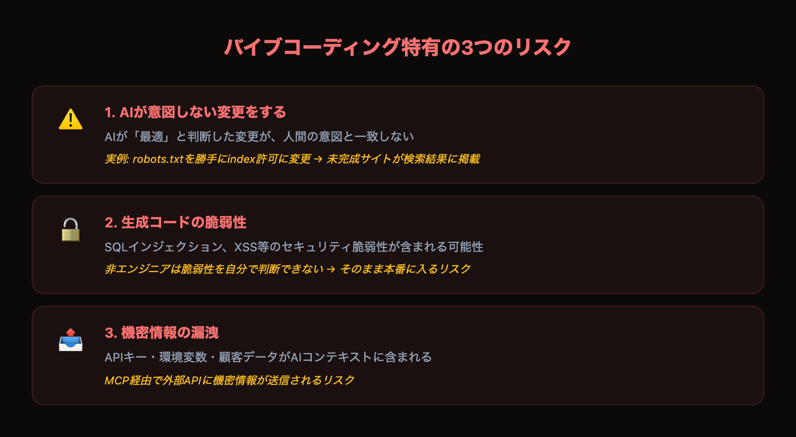 私自身、Claude Codeで開発中にAIがrobots.txtを勝手に変更し、未完成のクライアントサイトが検索エンジンにインデックスされてしまったインシデントを経験しています。この記事では、バイブコーディング特有のセキュリティリスクと、実務で効果のあった具体的な対策を解説します。