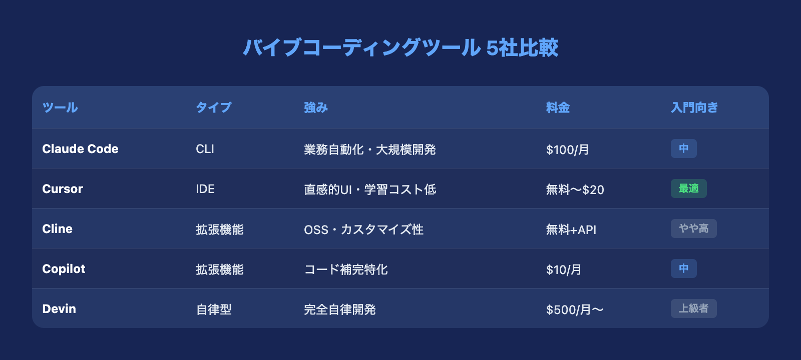 バイブコーディングを始めようとすると、最初にぶつかるのがツール選びです。Claude Code、Cursor、Cline、GitHub Copilot、Devin——選択肢は増え続けていますが、それぞれ得意分野が異なります。
